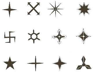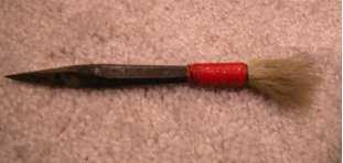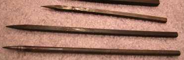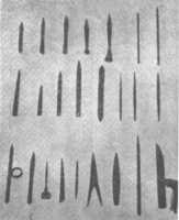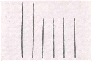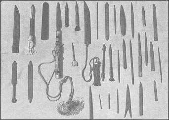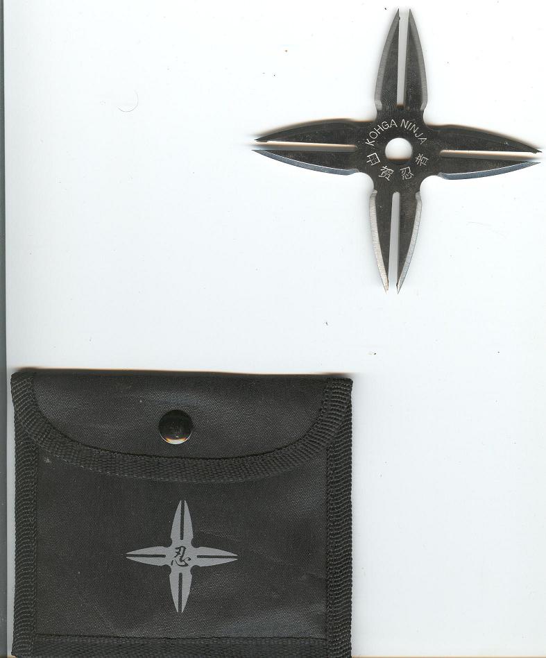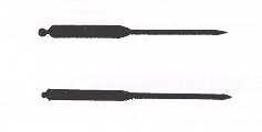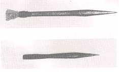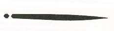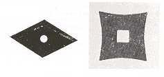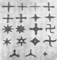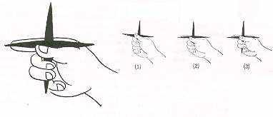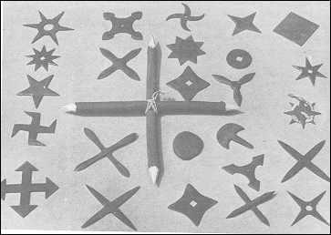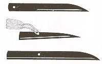 Рис. 5. Сюрикены Негиси Рю.  Рис 6. Сюрикен Негиси Рю с привязанной к хвосту кисточкой. Из собрания Чарльза В. Грузански (фотографии публикуются с любезного разрешения Роберта К. Грузански) Другие стили и типы сюрикенов. Существуют другие менее известные стили сюрикен-дзютсу, и огромное разнообразие форм лезвий. Вот еще несколько примеров. Мейфу Синкаге Рю Сюрикен-дзютсу. Я не знаю ничто об этом стиле, но в настоящее время пытаюсь его исследовать. Подозреваю что сведения о нем можно найти в одной из школ вышеупомянутого Синкаге Рю Дзю Дзюдзютсу... Существует видеофильм об этом стиле боевого искусства. Тенсин Сёдэн Катори Синто Рю. Этот стиль - один из наиболее известных в боевых искусствах Японии, с долгой и выдающейся историей. Это - сложное искусство, использующее кроме меча многие другие виды оружия, включая сюрикен. Как и во многих других школах, сюрикен-дзютсу преподавалось здесь как часть техник фехтования. Существует описание двух различных лезвий. Одно из них - хаси, в форме "лезвия топора", квадратный в сечении стержень, заостренный с одного конца и утолщенный с другого (см. рис. 10). На рис. 9 показана другая версия (шестиугольник слева от рисунка дает представление о форме и толщине его хвостовой части).  Рис. 9. Сюрикен известной школы фехтования Катори Синто Рю.  Рис. 10. Сюрикены Катори Синто Рю (Л и M), и Иккю Рю (R). Татсуми Рю. Эта школа – всеобъемлющее боевое искусство, основанное Татсуми Санкё примерно в середине 15 века, и все еще существующая сегодня. В ней представлен полный набор оружия, включая сюрикен, а также тактика и стратегия военных действий. Сведения относительно сюрикен-дзютсу в этой Рю в настоящее время недостаточны, хотя я подозреваю, что обучение метанию сюрикенов было включено в это искусство достаточно поздно. Отсуки Рю. Ясуда Дзендзиро, глава Отсуки Рю Кендзютсу из Хиросимы считает, что его учитель, Окамото Мунисигэ, самурай из области Айзу использовал сюрикен в ряде случаев во время своей службы в силах безопасности Сегуната. По рассказам он постоянно носил с собой около 12 лезвий спрятанных в различных местах, включая косита, заднюю спинку хакама. Кукисиндэн Тэнсин Хюхо. Кукисин Рю - другое древнее и всеобъемлющее боевое искусство, создание которого относится к 13 веку, и включающее обучение владению различными видами оружия и техникам борьбы без него. В этой школе используются заостренные квадратные металлические пластины шириной 7,5 см, называемые "теппан", которые, как считают, использовались против воинов в доспехах. Они имеют вогнутую форму граней и квадратное отверстием в центре, как это показано ниже на рис. 16. В некоторых документах Кукисин Рю имеется упоминание о таких пластинах, достигающих 12 см в диаметре. Кроме того, в ней используют "козука" или вспомогательный нож фехтовальщика, а также обычные "бо-сюрикены". Иккю Рю. Иккю Рю - название относительно молодого стиля, созданного современным мастером сюрикен-дзютсу и главой школы Сираками Иккю-кен. Он был учеником мастера Нарусэ Кандзи (умер в 1948), который обучался в Ямамото Рю, и написал книгу по фехтованию японским мечом, после участия в войне с Китаем в начале столетия. Мастер Нарусэ был учеником Йонегава Магороку, который в свою очередь обучался у вышеупомянутого основателя Сираи Рю, Сираи Тору. У своего преподавателя, Сираками изучал и Сираи Рю и Негис