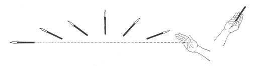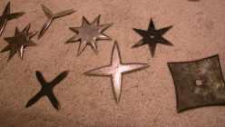 Введение в сюрикен-дзютсу и краткая история искусства. Введение. Слово сюрикен, составленное из иероглифов "сю", "ри" и "кен", буквально переводится как "лезвие скрытое в руке". Существует расхожее неверное представление, что эти иероглифы означают "рука бросающая лезвие", но иероглиф "ри" составлен морфемой (смысловой компонент) "и" как в слове одежда, в смысле покрытия чего-либо, также как и фонема (звуковой составляющей) "ли", вместе представляющих идею "перемены, движения назад, или быть охваченными". Ри также читается в кун йоми как ура, что людям, имеющим отношение к боевым искусствам, знакомо по выражениям типа "ура ваза" в противоположность "омотэ ваза". В комбинации с первым иероглифом, "сю-ри" означает "скрытый в руке, или в ладони". "Кен" означает лезвие, и пишется тем же самым иероглифом как в словах бокен, или синкен, следовательно, получается "лезвие скрытое в руке". Существуют два основных типа сюрикенов: бо сюрикены, которые являются длинными, тонкими цилиндрическими стержнями, различной формы и толщины, и сякены, которые сделаны из плоских металлических дисков. Сякены далее классифицируются как хира сюрикены, многолучевой, звездообразной формы, и сенбан сюрикены, которые являются прямоугольной или квадратной формы лезвиями, делавшимися из металлических пластин подкладывавшихся под шляпку гвоздя при строительстве традиционных Японских зданий. Существует также 3-ий тип, называемый тепан, который является более крупной версией сенбан, некоторые до 20 см по ширине, делавшиеся также из пластин подкладывавшихся под гвоздь, но можно ли их классифицировать, как сякены вызывает в настоящее время большое сомнение. Основные техники метания сюрикенов несколько различаются в разных школах, главные образом из-за формы их лезвий и методов использования. Происхождение. Метание предметов без сомнения было обычной практикой для людей в течение тысяч лет, и с тех пор как древний человек узнал, что он может защищать себя и получать еду, бросая камни в живых существ, получили развитие идеи о технике броска. Изучение развития метания предметов на протяжении всей истории человечества было бы делом почти невозможным, поэтому в этой статье внимание главным образом будет уделено тщательно отточенной традиционной японской технике метания оружия цилиндрической формы. Самый ранний Японский трактат, Кодзики (около 600 г. н.э.), содержит упоминание о том, как принц Ямато-Такеру бросает цилиндрический овощ в глаз белого оленя, чтобы его убить. Нихон Соки (также около 600 г н.э.) упоминает бросающее камни оружие называемое исихаджики, но возможно это была праща. Другой древний трактат, Мануеси, описывает метание стрел. Осака Гунки (военные записи Осаки) содержат отрывок, в котором говорится: "Тадамаса защитился от противника, тем, что выхватил свой вакидзаси и метнул его, как будто это был сюрикен." Рассказывается, что позже Тадамаса создал первый стиль сюрикен-дзютсу - Танто-гато, получивший свое название от короткого меча. Ган Рю, или Ганритсу Рю. Не вызывающее сомнений раннее упоминание о метании лезвий можно обнаружить в документах Ганритсу Рю, школы основанной Матсубаяси Хеньюсай, профессиональным фехтовальщиком состоявшем на службе у 18-ого дайме Матсухиро в Каней, около 1624 года. Эта школа стала основой Катоно, или Изу Рю, созданной самураем из Сендай, 