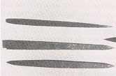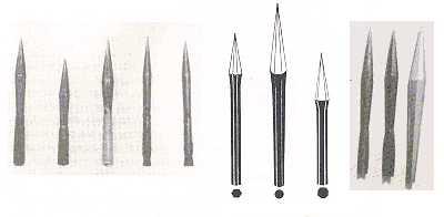 Основная форма лезвий в Негиси Рю – цилиндрический стержень, имеющий утолщенную головку и хвост, подобно авиационной бомбе (См. рис. 5). Они весят около 50 граммов, и иногда имеют кисточку из волос или хлопка, привязанную к хвосту, чтобы обеспечить прямой полет.